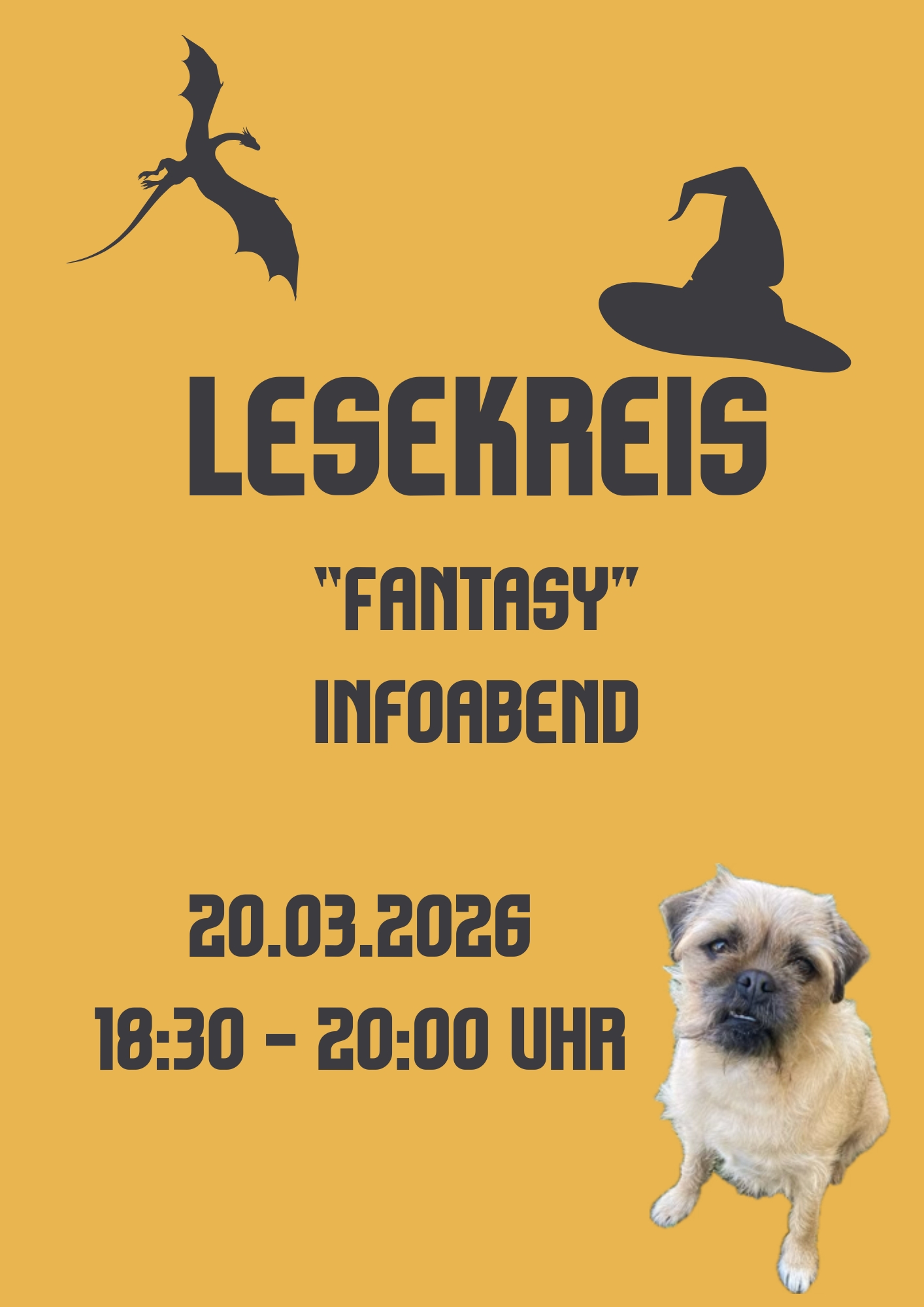 Ich starte einen Lesekreis zum Thema "Fantasy" im Büchermops. Am 20.03.2026 ab 18.30 Uhr findet unser erstes Treffen statt. Dabei entwickeln wir gemeinsam den genauen Ablauf unseres neuen Lesekreises. Kommt also gerne vorbei. Es gibt auch Snacks und leckeren Tee.